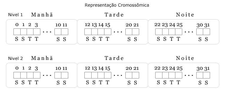 Cromossomo Timetabling com algoritmos genéticos resultadso.pdf - Pagina 3.Como se pode notar na Figura 1, a representação da distribuição dos horários é implementada em um vetor de duas dimensões, onde a primeira dimensão representa os níveis e a segunda dimensão, os slots de tempo.A granularidade do intervalo entre um slot de tempo (elemento do vetor) e outro são 2 créditos, por exemplo, o professor/disciplina alocado no slot 0 da manhã,representa uma disciplina no intervalo das 08:00 até 09:40; um professor/disciplina no slot 1 da manhã, representará uma disciplina no horário das 09:55 até 11:35. O turno da manhã é o único com possibilidade de aulas no sábado, por isso o tamanho distinto de 12 elementos em relação aos outros turnos de 10 elementos cada.