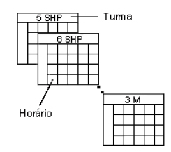 Cromossomo O PROBLEMA DE GERAÇÃO DE HORÁRIOS.pdf - Pagina 4.Para representar a solução no problema da geração de horários, foi escolhida uma formaintuitiva, onde cada gene representa um slot (ex: segunda-feira às 8:00 h). Um cromossomo seriarepresentado por uma matriz tri-dimensional (Número de turmas X Número de Dias X Número deHorários). A representação proposta tem a vantagem de não permitir, devido a sua codificação, queduas disciplinas referentes a mesma turma sejam lecionadas no mesmo horário. Porém, não garante anão ocorrência de colisões de professores e outras restrições.Cada indivíduo é formado por uma matriz de três dimensões conforme mostrado na figura