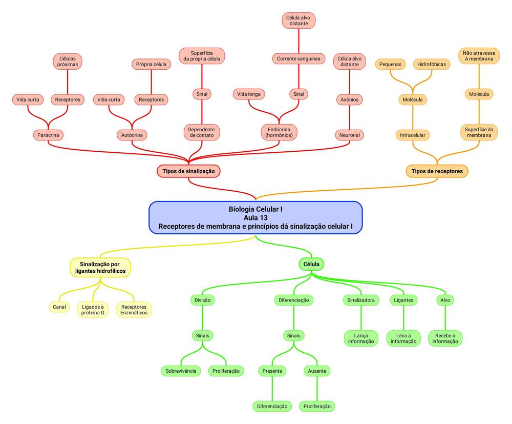 LICENCIATURA EM CIÊNCIAS BIOLÓGICAS – CEDERJ - UENF SEGUNDO PERÍODO DISCIPLINA: Biologia Celular 1 Aula 13: Receptores da membrana e princípios da sinalização celular I Introdução · Célula sinalizadora: lança a informação. · Ligante: leva a informação. · Célula alvo: recebe a informação. Tipos de sinalização a. Parácrina: a molécula sinalizadora tem vida curta e os receptores estão nas células próximas. b. Autócrina: a molécula sinalizadora tem vida curta e o receptor está na própria célula que emitiu o sinal. c. Dependente de contato: a molécula sinalizadora não é secretada, ficando exposta na superfície da célula sinalizadora, e a célula-alvo precisa fazer contato para que o receptor possa se ligar. d. Endócrina: a molécula sinalizadora tem vida longa, é lançada na corrente sanguínea e vai atingir células-alvo em locais distantes. Estas moléculas são os hormônios. e. Neuronal: esta molécula viaja grande distância dentro de prolongamentos celulares dos neurônios, os axônios, indo atingir a célula-alvo longe do corpo celular do neurônio que emitiu o sinal, mas próximo do axônio de onde foi secretada. Um sinal pode gerar muitas respostas diferentes · Na corrente sanguínea circulam muitos hormônios, secretados por diferentes células, que atingirão várias células, mas só algumas expõem o receptor adequado. · Do mesmo modo, um neurônio possui diferentes prolongamentos para alcançar as células que possuem os receptores capazes de reconhecer o neurotransmissor. Célula que não se comunica, se "trumbica" · Se a célula não recebesse nenhum sinal morreria. · Para se dividir, a célula precisa dos sinais de sobrevivência e proliferação. · Para a célula se diferenciar, ou seja, especializar-se, é preciso que os sinais de proliferação estejam ausentes, e que ao mesmo tempo, apareçam sinais de diferenciação apareçam. · O soro utilizado em meio de cultura possui sinais de proliferação conhecidos e desconhecidos. Tipos de receptores a. Se a molécula sinalizadora for pequena e/ou hidrofóbica o suficiente para atravessar a membrana, o receptor deve ser intracelular; b. Se a molécula sinalizadora não puder atravessar a membrana, o receptor terá de estar obrigatoriamente na membrana plasmática, exposto na superfície celular. · Os receptores para moléculas hidrofílicas ficam voltados para o meio extracelular (a) enquanto os receptores para sinalizadores pequenos e hidrofóbicos são intracelulares Sinalização por ligantes hidrofílicos · Tipos de receptores de sinalização: a. Canal: Controlados por ligantes. (Aula 10 e11) b. Ligados a proteína G: são proteínas transmembranas multipasso. As proteínas G funcionam como interruptores: com GTP estão “ligadas” e com GDP estão “desligadas”. c. Receptores enzimáticos: Elas têm em comum, além de serem ativadas por proteína G, claro, o fato de sua ação enzimática gerar produtos pequenos e de curta duração, os mensageiros secundários. Vamos estudar uma de cada vez na aula seguinte. Em comum eles possuem o fato de serem proteínas transmembrana e não entrarem na célula, a não ser que sejam degradados.