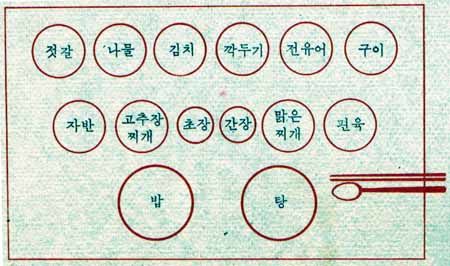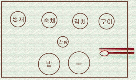 3첩(기본 음식) 밥, 국, 김치, 간장(반찬의 종류) 숙채/생채, 구이/조림, 마른반찬&젓갈