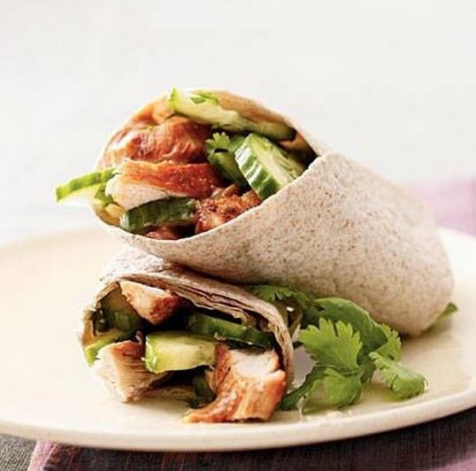 Thai Chicken Wraps Yunhee Kim Prep Time: 5 Cook Time: 16 Yield: Makes 4 servings (serving size: 1 wrap) Good to Know Peanuts are high in monounsaturated fat and protein. Use this Thai sauce in moderation so you get the peanut flavor and nutrients but not all the calories. Ingredients 4 (6-ounce) skinless, boneless chicken breast halves 4 teaspoons olive oil 1/4 teaspoon salt 1/4 teaspoon pepper 1/2 seedless cucumber, halved lengthwise and sliced 3 teaspoons chopped fresh cilantro 4 (8-inch) whole-wheat tortillas 4 tablespoons Thai-style satay peanut sauce (such as Ka-Me) Preparation 1. Heat a grill pan over high heat. Rub chicken breasts with oil, and sprinkle with salt and pepper. 2. Add chicken to the pan, and reduce heat to medium. Cook 6 minutes on each side (depending on thickness of meat) or until cooked through. Remove from pan, let sit for 5 minutes, and slice diagonally into pieces. 3. Combine the cucumber slices and chopped cilantro in a bowl. 4. Assemble the wraps just before you are ready to serve. Heat a nonstick skillet over medium heat, and heat tortillas 15-20 seconds on each side. 5. Spread 1 tablespoon satay sauce on each tortilla. Top each with chicken slices and 1/4 of the cucumber mixture. 6. Fold in sides of tortillas, and serve immediately. Nutrition Information Calories per serving 369g Fat per serving 14g Saturated fat per serving 2g Monounsaturated fat per serving 6g Polyunsaturated fat per serving 2g Protein per serving 38g Carbohydrates per serving 21g Fiber per serving 4g Cholesterol per serving 94mg Iron per serving 3mg Sodium per serving 663mg Calcium per serving 68mg