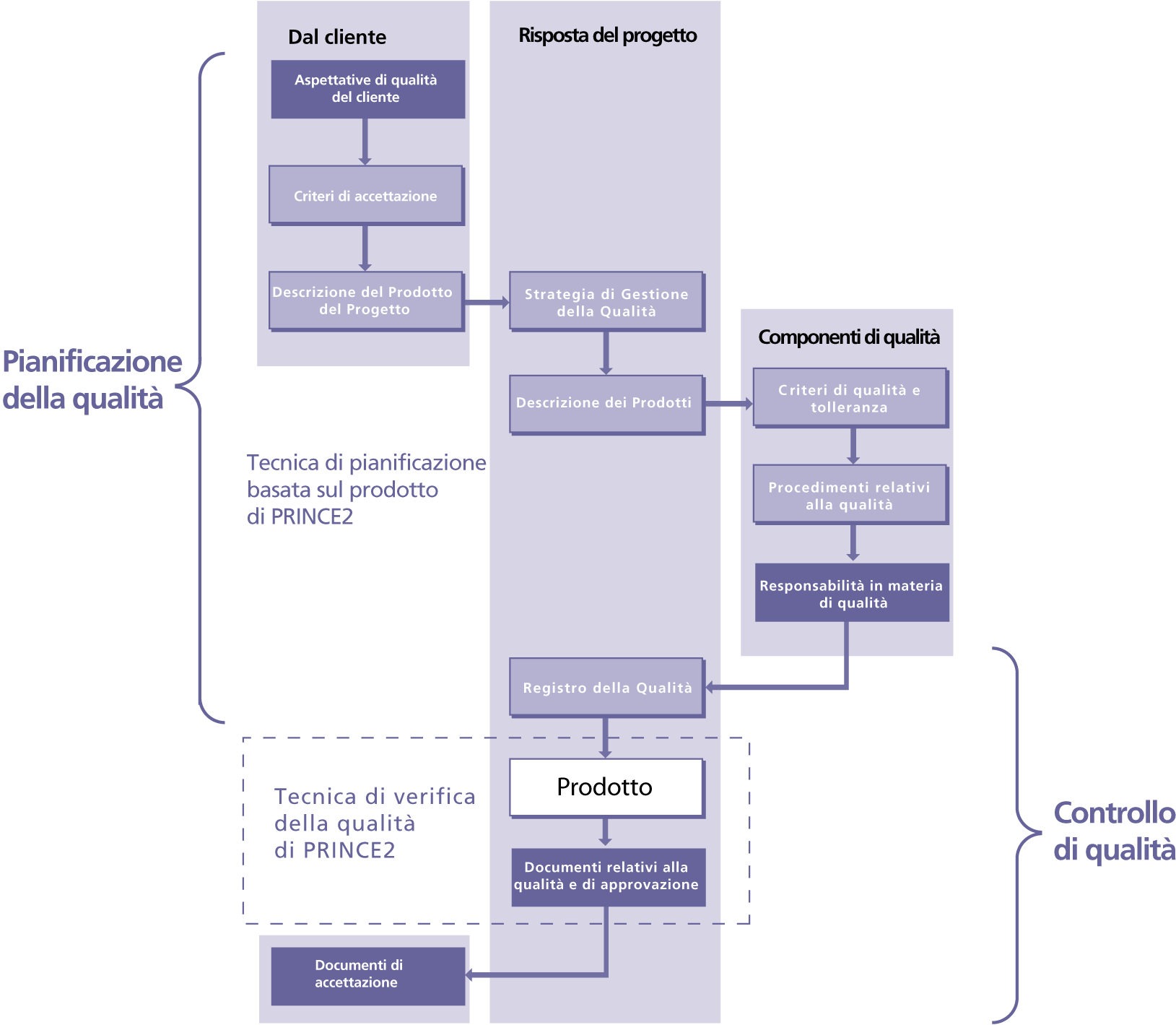 Al fine di prevedere tempistiche e costi totali del progetto è necessario stabilire i criteri di qualità dei prodotti e le attività di gestione della qualità da includere nei piani di progetto.Un altro obiettivo della tematica della Qualità è l'implementazione di miglioramenti continui durante il progetto. Nell'ottica di PRINCE2 questo è reso possibile dal rilevamento delle lezioni apprese e delle azioni ad esse legate.Al fine di effettuare un qualsiasi controllo, complesso quello sulla qualità, è necessario disporre di un piano.La pianificazione della qualità si occupa dei prodotti da realizzare durante il progetto, della definizione dei loro rispettivi criteri e procedure per la qualità e le specifiche responsabilità in questo campo di coloro che partecipano al progetto.È buona prassi assicurarsi che la garanzia di qualità sia esterna al team di gestione del progetto poiché essa consiste nel controllare che siano presenti all'interno del progetto un'organizzazione e dei processi adeguati per pianificare e controllare la qualità quando opportuno.Mentre la Garanzia del Progetto si considera interna al progetto, la Garanzia di Qualità, essendo responsabilità della direzione aziendale, viene considerata esterna al progetto.