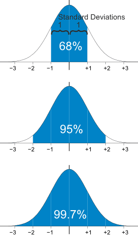 The standard deviation is a measure of the width of the curve. It gives an indication of the range of values either side of the mean. A standard deviation is the distance from the mean to the point where the curve changes from being convex to concave (the point of inflexion). 68% of all the measurements lie within the _+1.0 of standard deviation, and 95% lie within the _+2.0. A large standard deviation means a lot of variety, whereas a small standard deviation means little variety.