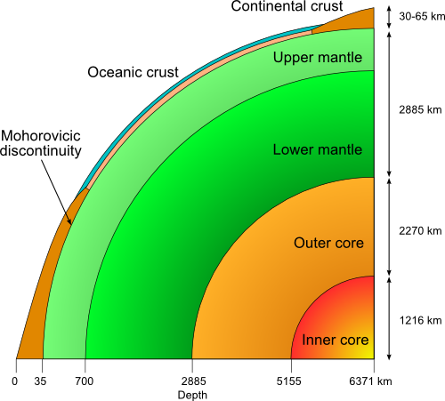 The inner core - iron and nickelThe outer core - ironThe mantle - molten/semi-molten rockThe crust - oceanic/continentalOceanic - e.g. basalt (SiMa 3-10km, dense, younger)Continental - e.g. granite (SiAl 30-70km, less dense, older)