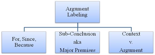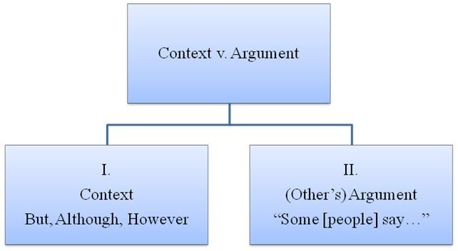 The bottom three boxes introduce the terminology for this lesson. For some initial clarification, "context" can either mean (1) "background information", or (2) "other's/another's argument(s)." Context may have its on premise & conclusion embedded within the reading aside from the author's real argument (or purpose).