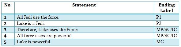 The (Expanded) Argument All Jedi use the force. Luke is a Jedi. Therefore, Luke uses the Force. All force users are powerful. Luke is powerful.