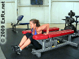 Preparation Stand between ends of two benches. Place hands on ends of benches with fingers off ends of benches. Grip should be somewhat narrow. Position feet in front with legs bent and torso upright. Execution Lower body by bending arms allowing elbows to point back. When slight stretch is felt in chest or shoulders push body up until arms are straight. Repeat.