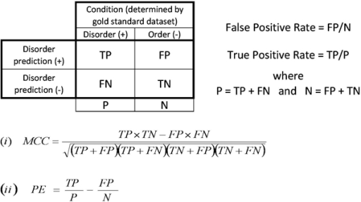 Figure 3: Contingency table and common performance measurements. The abbreviations are for the number of true positive (TP), false positive (FP), false negative (FN) and true negative (TN) predictions. The False Positive Rate (FPR) was calculated as FP/(FP+TN) and the True Positive Rate (TPR) as TP/(TP+FN). The Matthews Correlation Coefficient (MCC) is shown in equation (i) and the probability excess (PE) in equation (ii).