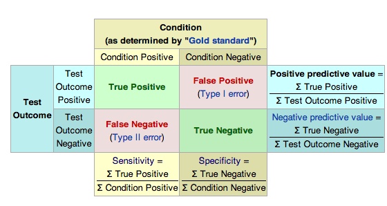 Imagine a study evaluating a new test that screens people for a disease. Each person taking the test either has or does not have the disease. The test outcome can be positive (predicting that the person has the disease) or negative (predicting that the person does not have the disease). The test results for each subject may or may not match the subject's actual status. In that setting: True positive: Sick people correctly diagnosed as sick False positive: Healthy people incorrectly identified as sick True negative: Healthy people correctly identified as healthy False negative: Sick people incorrectly identified as healthy In general, Positive = identified and negative = rejected. Therefore: True positive = correctly identified False positive = incorrectly identified True negative = correctly rejected False negative = incorrectly rejected In statistics and diagnostic testing, the positive predictive value, or precision rate is the proportion of positive test results that are true positives (such as correct diagnoses). It is a critical measure of the performance of a diagnostic method, as it reflects the probability that a positive test reflects the underlying condition being tested for. Its value does however depend on the prevalence of the outcome of interest, which may be unknown for a particular target population. The PPV can be derived using Bayes' theorem.