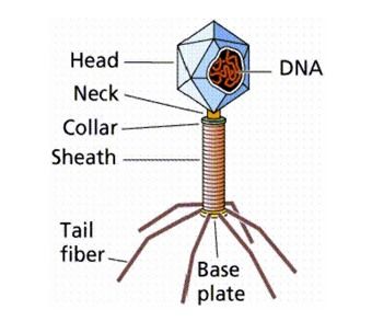 Multiply within bacteria eg. E.Coli Isocohedral head and helical tail Contain DNA Phage rep time: 20-40 mins (50-200)