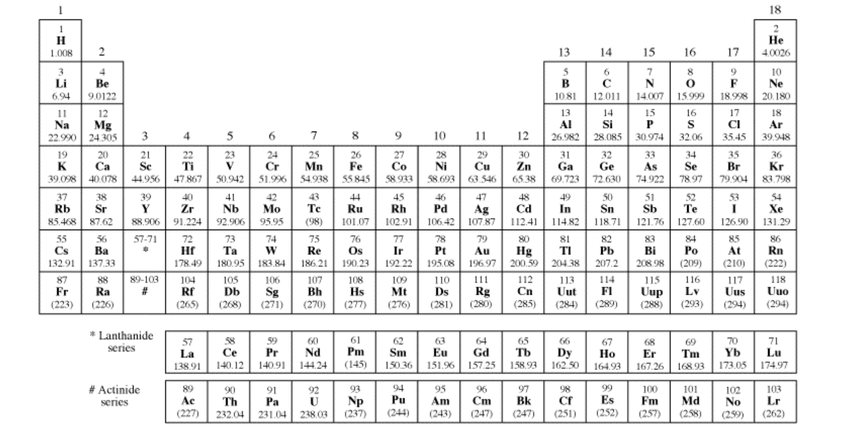 In this Periodic Table, the Relative atomic Mass and the Atomic number are both displayed above and below each atom.