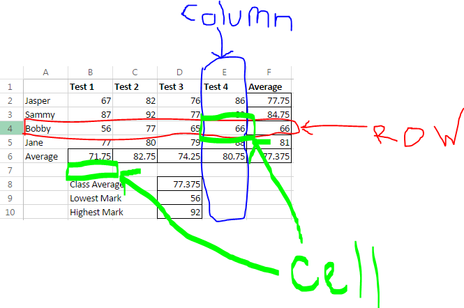Column Runs Vertically (Up/Down) which is circled in blue below Row runs Horizontally (across) which is circled in red belowCell is where the column and row "intersect" and is a single value and is circled in green below (just like you know when you have a "hit" in battleship