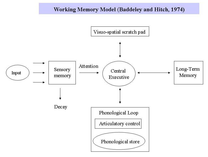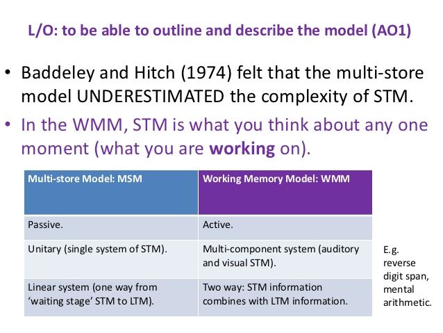 the working memory model...proposed by Baddeley and hitch the working memory model s a challenge to the MULTI STORE MODEL proposed by Atkinson and shiffrin. They claimed that the short term memory is a unitary store, however this model proposes that memory is an alliance of several memory systems working together. this model is mostly interested in the STM and how it intergrates informations.the model puts forward a system involving active processing and short term storage information. it suggest that there are three main components of working memory;1. the central executive2. the phonological loop3. the visuo-spatial scratchpad 4. the episodic bufferWHAT DO THESE COMPONENTS DO?1. the central executive; This is the key component of the working memory, the function is to direct attention to particular tasks, determining at any time how the three slave systems are allocated to tasks. it has a limited capacity and cant attend to many tasks at once. the central executive acts like an attention system deciding which information entering the senses should be attended to.2. the phonological loop (slave system 1); The phonological loop deals with auditory information and preserves the order of information. it consists of the phonological store and the articulatory loop. the phonological store holds the words you hear like a inner ear, its similar to the articulatory loop in that it stores sound but it stores sound without meaning. it stores acoustically coded items in sequence for a short period of time. the articulatory loop is used for words that are heard or seen these words are silently repeated (looped) like an inner voice, a form of maintenance rehearsal. the articulatory loop holds verbal information in auditory code. it silently repeats words that are heard or seen, eg trying to remember a phone number, you 'hear' it being repeated in your head.3. the visuo-spatial scratchpad (slave system 2) this stores/manipulates visual and spatial information, it deals with information involved in pattern recognition and perception of movement. it deals with what items look like and the physical relationship between them, its active during visual tasks.4. the episodic buffer (slave system 4) this is an extra storage system that has a limited capacity, just like the other working memory components, the episodic buffer integrates/ brings together information from the central executive, phonological loop, visuo spatial sketchpad and also long term memory.EVIDENCE SUPPORTING THE WORKING MEMORY MODEL...the key study to the working memory model is BADDELEY AND HITCH 1974. aim; to investigate whether participants can use different parts of working memory at the same time. the dual task technique was used to test this.method; participants were given two tasks to do simultaneously (at the same time). task 1; ps were given a task that occupied the visuo-spatial sketchpad (eg draw a cat) and articulatory loop (repeating word the). task 2; ps were given a task that involved both the articulatory loop and the articulatory loop!results; task 2 was completed more slowly by participants when they were given a task involing the same component (articulatory loop). task 1 was completed much quicker when given tasks that involved different components (articulatory loop and visuo-spatial sketchpad.conclusion; the study suggests that oing two tasks that involve the same component causes difficulty. it also suggest that when different components are used performance is not affected.EVAULUATION OF BADDELEY AND HITCH;strength; AS ITS A LAB EXPERIMENT IT HAS HIGH LEVELS OF CONTROL OVER EXTRANEOUS VARIABLES AND THEREFORE WE CAN EASILY ESTABLISH CAUSE AND EFFECT. THEREFORE ALSO THE EXPERIMENTER CAN BE SURE THAT THE IV (TYPE OF TASK PS UNDERGOES) DIRECTLY EFFECTED THE DV (LENGTH OF TIME IT TOOK PARTICIPANTS TO UNDERGO THIS TASK). THIS IS A STRENGTH AS BADDELEY AND HITCHS RESULTS ARE RELIABLE AND STRONGLY SUPPORT THE CLAIMS OF THE WORKING MODEL OF MEMORY THAT STATES THE STM IS NOT A UNITARY STORE.weakness; AS ITS A LAB EXPERIMENT IT THEREFORE HAS LOW ECOLOGICAL VALIDITY AND THE METHOD THAT BADDELEY AD HITCH USED DOESNT TEST MEMORY IN A REALISTIC AND MEANINGFUL WAY. BY ANSWERING A SET OF TRUE OR FALSE QUESTIONS WHILST SIMULATENOUSLY COMPLETEING ANOTHER TAK IT DOESNT TEST THE TRUE COMPLEXITY OF THE STM. THIS IS A LIMITATION AS BADDLEY AND HITCHS RESULTS CANNOT NESSARSARILY BE GENERALISED TO REAL LIFE AND THEREFORE MAY NOT PROVIDE VALID SUPPORT FOR THE WMM.HOW DOES THIS STUDY SUPPORT THE WMM?The results suggest that its easier to do two taks at the same time if they use different processing systems than if you use the same slave system, this shows that stm is more complex than suggested by the MSM, and suggest that stm is better seen as a number of independent processing mechanisms rather than as a unitary store. it also supports the assumption that the components have a limited capacity.EVALUATION OF THE WORKING MEMORY MODEL;strengths; one strength is that it gives a detailed explanation of how the stm works and is a significant advancement from the multi-store model. the model explains why its possible to simultaneously complete two tasks that require different slave systems and why its difficult to complete two tasks that require the same system.ANOTHER STRENGTH; it has support from PET scans, as they have shown brain activity occuring in different areas when individuals are carrying out different tasks and this activity corresponds with the four systems that the model proposes. this is a strength as it suggest that the stm does have different compnents a the wmm maintains.weakness; the multi store model challenges the components of the working memory model, the msm proposes that stm is not made up of four separate stores instead it claims the stm is a single unitary store. the msm therefore challenges the idea of the central executive, and the 3 slave systems.ANOTHER WEAKNESS; psychologists know very little about the central exe