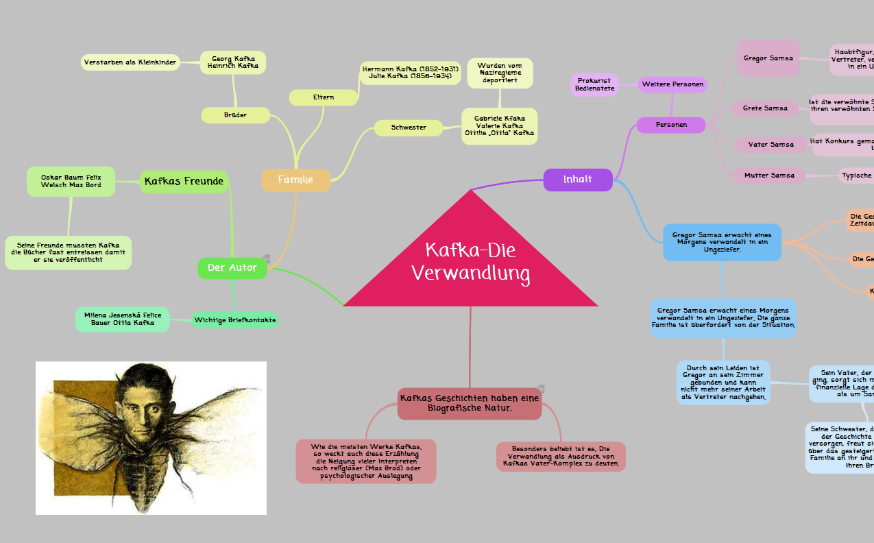 KURZZUSAMMENFASSUNGFranz Kafkas 1915 erschienene Erzählung »Die Verwandlung« zählt zu den wichtigsten Werken des gebürtigen Österreichers. Im Mittelpunkt der Handlung steht die Prager Familie Samsa, bestehend aus Gregor Samsa, dessen Schwester Grete sowie den Eltern. Weitere Personen sind ein Prokurist und mehrere Bedienstete der Familie Samsa. Zeitlich ist das Stück um die Jahrhundertwende (19. / 20. Jahrhundert) angesiedelt, die Handlung erstreckt sich über einen Zeitraum von etwa sechs Monaten.