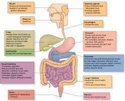Oesophagus:Tube from the mouth down to the stomach. Moves food by peristalsis. No digestion occurs.