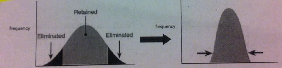 Stabilising SelectionIndividuals that vary from the mean are selected against (i.e. the extremes of the range of variation). This actually decreases variation in a population.e.g. Coelacanth fish have retained an almost constant form