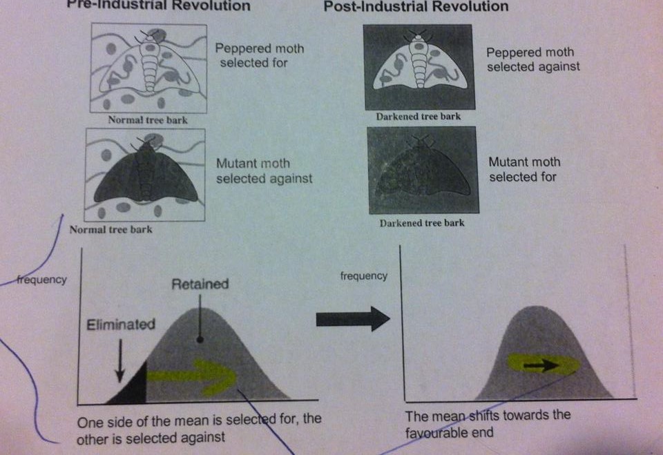Directional SelectionIndividuals at one side of the mean (towards one extreme of the range of variation) are selected for and will increase in number. Individuals at the other side of the mean are selected against and their numbers decreasee.g. Peppered moths. The dark mutant was selected for during the Industrial Revolution when it camouflaged against the dirty black bark of the trees