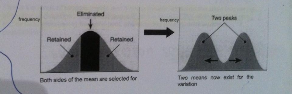 Disruptive SelectionIndividuals with variation on either side of the mean (both extremes of the range of variation) are selected for and those closest to the mean are selected against. The mean moves in two different directions. This can be the start of speciation as two different variants will develop in the population.E.g. African black-bellied finch. Those with large beaks can crack hard seeds, those with small beaks can feed on soft seeds, those with intermediate beaks are not well adapted to do either.
