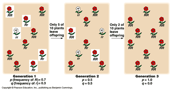 DEFINITION: Random changes in allele frequencies in a population due to chance.This is the result of random events and it has a greater impact on the allele frequencies of smaller populations. In a small population it is possible that alleles may become lost or fixed (decreasing the gene pool, and reducing genetic variation in the population).