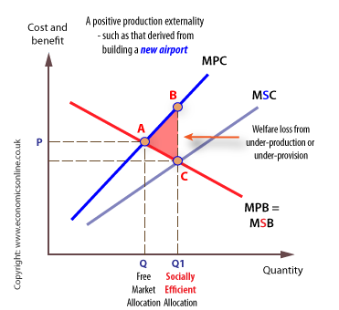 This means the marginal private cost of production exceeds the marginal social cost. The social equilibrium B is greater than the market equilibrium A, which shows that the good is being under-produced and consequently under-consumed e.g. improving quality of staff training. ABC represents the welfare gain to society, which represents the positive externalities in production e.g. higher pay - more taxes. Society would prefer a higher level of production because of the welfare gain. However, improving the quality of training staff is expensive and so many firms will ignore this because they may not enjoy the private benefits.