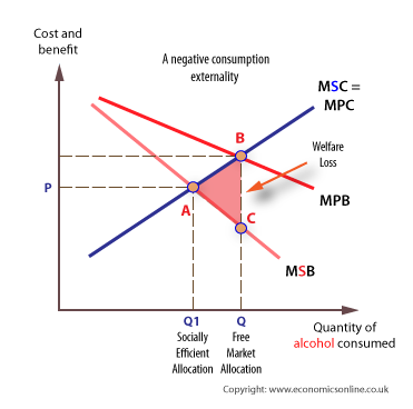 This means that the marginal private benefit exceeds the marginal social benefit of consumption. The market equilibrium B is greater than the social equilibrium A, which shows that the good is being overproduced and consequently over-consumed e.g. alcohol. ABC represents the welfare loss to society, which represents the negative externalities in consumption e.g. violence, vandalism etc. Society would prefer level of alcohol production and consumption because of the external costs being generated. To lower consumption, the state could increase taxes on alcohol.