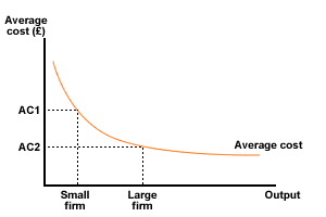 A small firm has to have a higher average cost AC1 to cover its cost of production. A larger firm with a greater output can set a lower price to cover its costs per unit AC2.