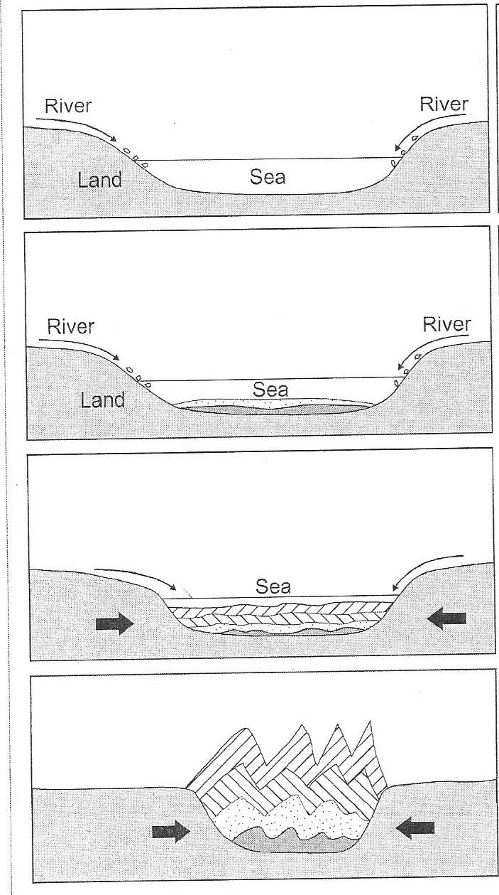 - River deposits sediment on the sea bed, this eventually builds up and the sediment begins to compress.- As the sediment continues to compress it forms sedimentary rock.- The two plates are moving towards each other while this occurs due to convection currents.- As they get close it forces the rock to buckle upwards forming jagged mountains.- In places the rock may crack and allow magma through, forming volcanoes.
