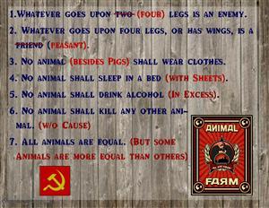 SymbolsMankind=capitalism and royaltyMr. Jones=Nicolas Alexandrovich Romanov (the last Tsar of Russia)Mr. Pilkington=Leaders of EnglandMr. Frederick=HitlerPigs=CommunistsNapoleon= Joseph StalinSquealer= Russian mediaSnowball=Leon TroskyOld Major= Karl Marx or Vladimir LeninHorses=working classBoxer=working classMollie=Russias upper classDogs=Army, military, and policeBirds=Ministers and priestsMoses= Russian Orthodox churchHens= Peasant farmersPigeons= Communist world revolutionOld Benjamin Donkey=Old MenMuriel=Old LadiesSheep=The massesThe Cat= Shady members of the Russian societyAnimal Farm=The Soviet UnionManner Farm= RussiaFoxwood=EnglandPinchfield= GermanyTown of Willington= EuropeFarmhouse= The KremlinThe Red Lion=Royal Palace in EnglandSugar Candy Moutain= HeavenAnimalism= CommunismHorn and Hoof= Hammer and Sickle Animal committees=Soviet Committees Beast of England=ideology of Communism Windmill=Stalins five year plan Drinking of alcohol=Intoxicating effect of power Milk and apples=Commodities The Animal Revolt=The Russian Revolution Battle of the Cowshed=The Reds V.S the Whites in the civil war between the bolsherikens (red) and the Bolsherikes (whites) The hens revolt=The bitter resistance to collective farming, Ukraine resistance Destruction of the windmill=The failure of the five year plan The slaughter of the animals=The purges of 1936-1938 Selling of the wood to Frederick=Nazi Soviet Pact The Battle of the Windmill=Battle of Stalingrad