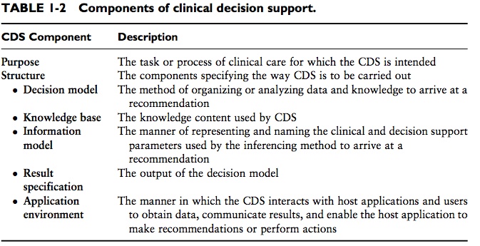 Computer-based clinical decision support (CDS) = the use of the computer to bring relevant knowledge to bear on the health care and well being of a patient. The general aim of CDS can be one or both of the following: * To make data about a patient easier to assess by, or more apparent to, a human. * To foster optimal problem-solving, decision-making, and action by the human. The exact nature of a particular form of CDS depends on its specific purpose. The decision support is provided to a user—who may be a physician, a nurse, a laboratory technologist, a pharmacist, a patient, or other individual with a need for it. In some instances, the user may be a computer program rather than a human user. Many possible settings can give rise to this need, such as a problem arising in clinical practice, a health maintenance/preventive care question of a patient, or a train- ing/educational exercise. A primary task of the computer is to select knowledge that is pertinent, and/or to process data to create the pertinent knowledge. To the extent that the computer can make the selection based on patient-specific data, the relevance of the CDS to the individual patient is enhanced. The selection of knowledge and processing of data involve carrying out some sort of inferencing process, algorithm, rule, or association method. The result of CDS is to perform some action, usually to make a recommendation.