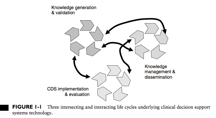 Knowledge generation and validation. The knowledge underlying CDS can be generated in a variety of possible ways. These are examined in Section III of this book. In general, the knowledge is initially unstruc- tured and unassembled, or even only implicit, and must be extracted (from experts, from databases, or from the literature), organized and synthesized, analyzed for consistency and accuracy, and represented in an unambiguous form that can be computer-interpretable and acted upon. There may be gaps or overlaps with existing knowledge, calling for studies to refine the knowledge. Any synthesis of knowledge about a topic should have an appropriate expiration date, at which time the sources should be re-reviewed and the knowledge updated if necessary. Thus each item of knowledge must go through a continuous life cycle process