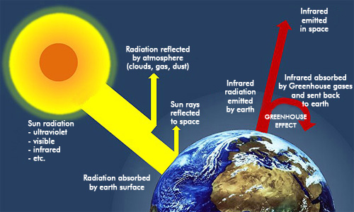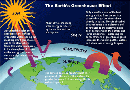 The Greenhouse Gas EffectThe greenhouse effect is a natural process by which some of the radiant heat from the Sun is captured in the lower atmosphere of the Earth, thus maintaining the temperature of the Earth's surface. The gases that help capture the heat, called “greenhouse gases,” include water vapour, carbon dioxide, methane, nitrous oxide, and a variety of manufactured chemicals. Some are emitted from natural sources; others are anthropogenic, resulting from human activities.The greenhouse effect refers to circumstances where the short wavelengths of visible light from the sun pass through a transparent medium and are absorbed, but the longer wavelengths of the infrared re-radiation from the heated objects are unable to pass through that medium. The trapping of the long wavelength radiation leads to more heating and a higher resultant temperature. Besides the heating of an automobile by sunlight through the windshield and the namesake example of heating the greenhouse by sunlight passing through sealed, transparent windows, the greenhouse effect has been widely used to describe the trapping of excess heat by the rising concentration of carbon dioxide in the atmosphere. The carbon dioxide strongly absorbs infrared and does not allow as much of it to escape into space.