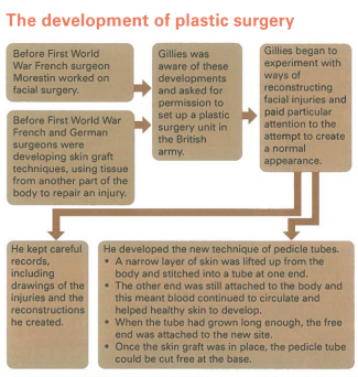 War and the development of surgery In the first world war surgeons often treated the wounded close to the front line where the large numbers of injuries and conditions made it difficult A great deal of experience was gained from working with a wide range of injuries and surgeons often devised new techniques to deal with it War can be said to have accelerated the training of surgeons Before the war surgeons wouldn't have touched the brain however the increasing numbers of brain injuries meant that surgeons had to try something To the left is a diagram showing the development of plastic surgery Between 1914 and 1921 over 41,000 men in the armed forces lost a limb, advances in prosthetic limbs included the use of light metal alloys and new mechanisms