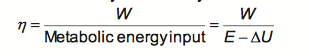 Work EfficiencyW- mechanical work done by body(E - change in U) - NET metabolic energy required to carryout work -If body does not add/use stored energy then (change in u) = 0 . Thus n= W/E ( then Q= -E)If (change in U) is NEGATIVE = WEIGHT LOSS -In body usually quite low ( 2-10%), 20-25%during exercise-When n -heat loss rate is usually about same at metabolic