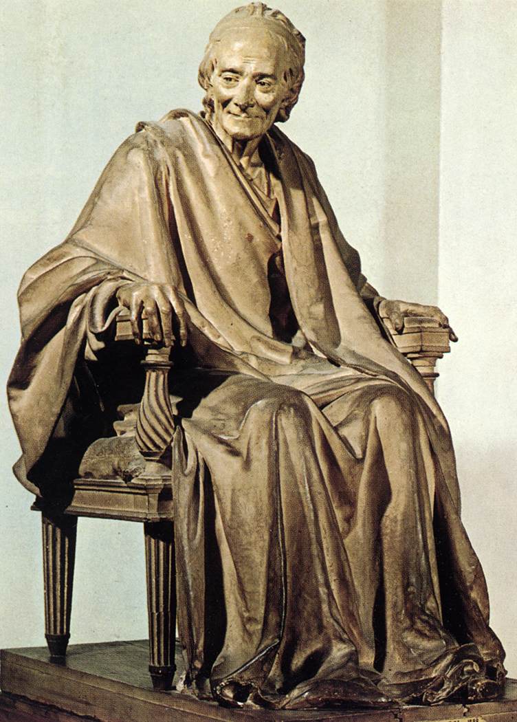 Neoclassical sculptures were usually made of marble and depicted mythological themes or famous people. Houdon's sculptures 'Voltaire' and 'Rousseau' are examples from this style. (Illustration: Jean-Antoine Houdon, 'Voltaire', 1781).