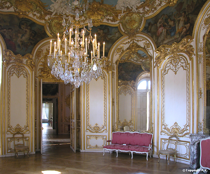 Rococo interiors were elaborately decorated, especially with curves, seashells and floral elements. In French, these decorative motifs are called 'rocaille', and this is the origin of the name 'Rococo'. A number of luxurious palaces were built in this style. (Illustration, Hôtel de Soubise in Paris).