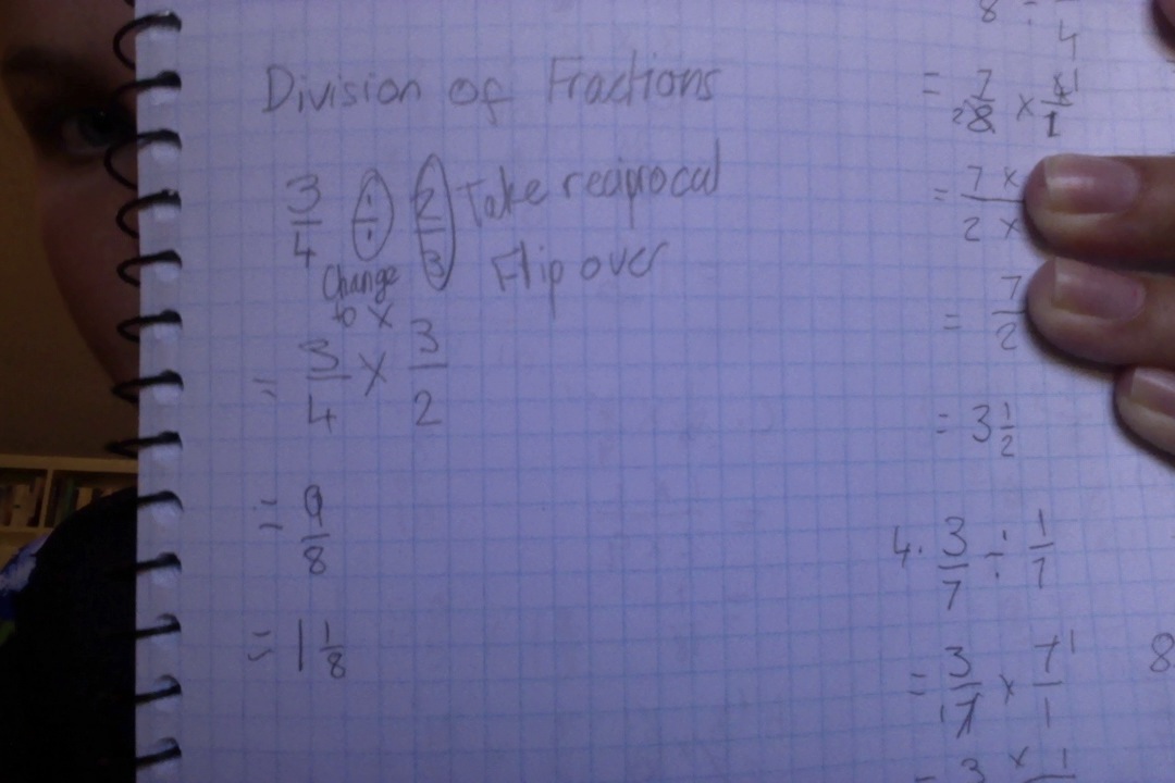 Devision with fractions. Take the reciprocal and flip over. Change the devision sign and change it to the multiplication sign.