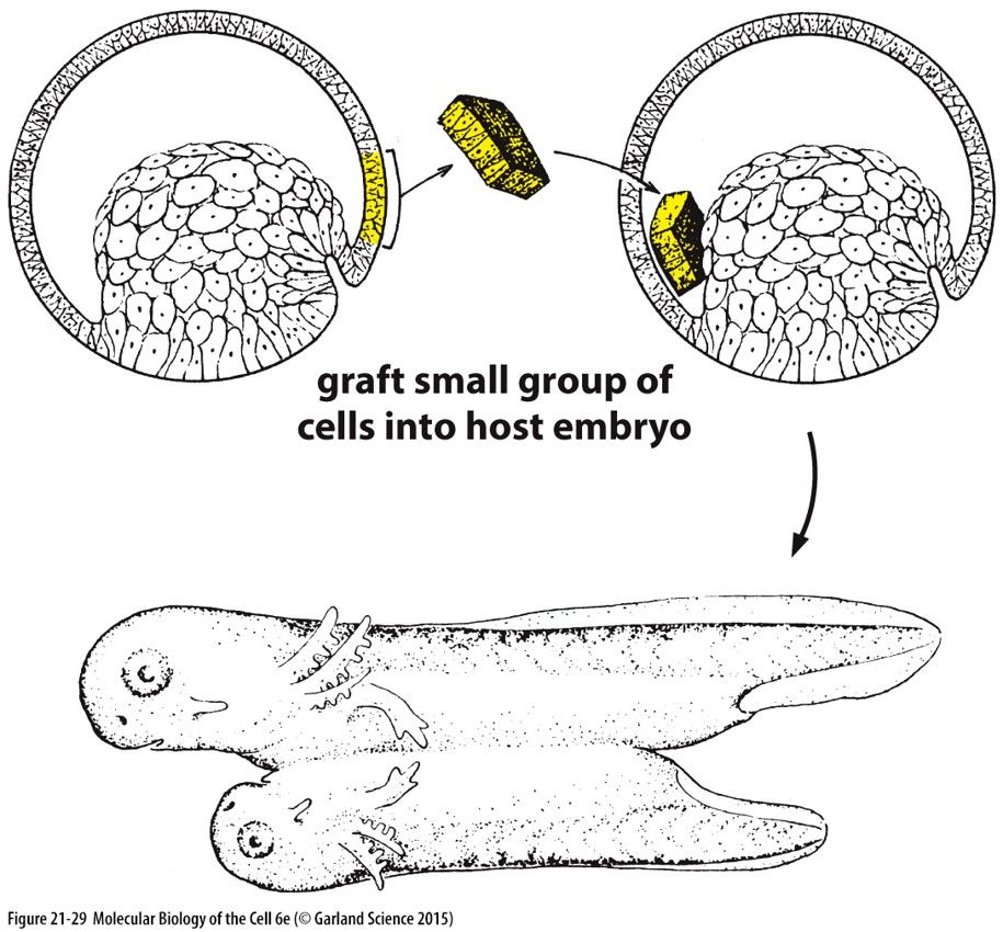 Spemann's OrganizerThe ORGANIZER or SPEMANN'S ORGANIZER contains the deep vegetal cells of the dorsal blastopore lip that controls gastrulation, The organizer is induced by the Nieuwkoop Centre. The ORGANIZER directly patterns the mesoderm from dorsal to ventral Identifying the OrganizerIf you transfer the dorsal lip from one embryo to a different posotion in another embryo. The transplanted endoderm and mesoderm will recruit the host epithelium to also involute and a secondary embryo with clear anterior-posterior and dorsal-ventral axes will form