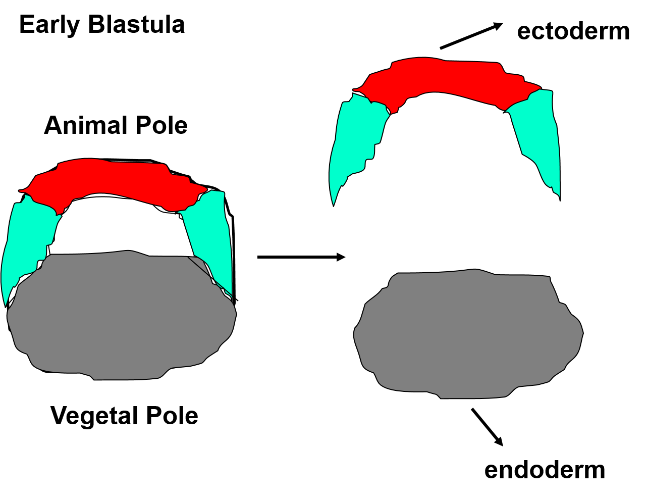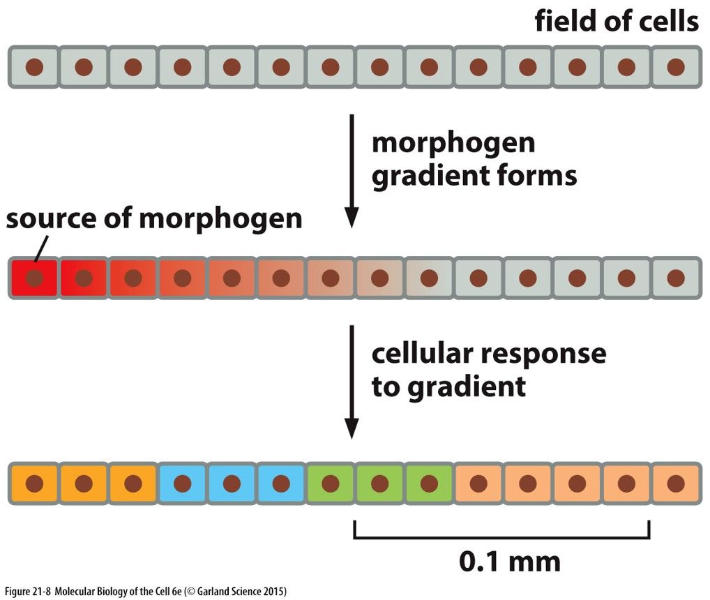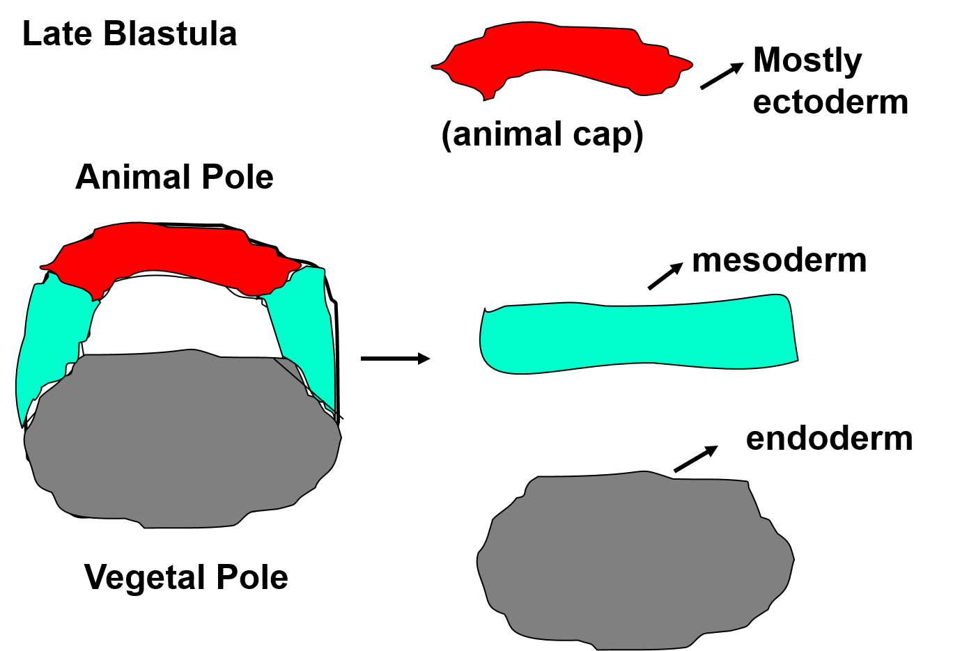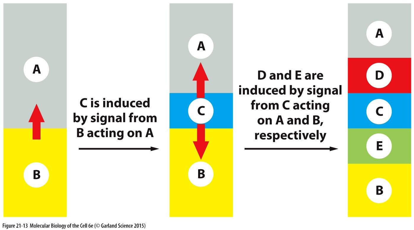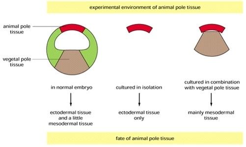 Formation and patterning of MesodermIf you culture the equatorial region of an early blastula in isolation it will form ectoderm. If you culture the equatorial region of a late blastula in isolation, it will form mesoderm.Therefore the vegetal cells must have INDUCED the equatorial cells to become mesoderm by the late blastula stage.Induction:The switching of cells from one differentiation pathway into another by the influence of adjacent cells.You can stimulate the inductive process that occurs before the late blastula stage by co-culturing the animal cap with the vegetal cells. The normal fate of cells of the animal cap is to form ectodermal cells. However if it the animal cap cells contact cells of the vegetal pole they can be enduced to form mesodermal cells. The dorsal vegetal cells induce dorsal mesoderm (notochord and muslce). The ventral cells induce blood.Dorsalizing the mesodermVentral mesoderm will normally become blood but if you place it adjacent to the Organizer it will become derivatives of lateral mesodermal cells.Mesoderm induction is mediated by morphogensMorphogen:An inducing factor that can evoke more than one positive response from the responding tissue. In a gradient, cells respond according to the concentration of morphogen.