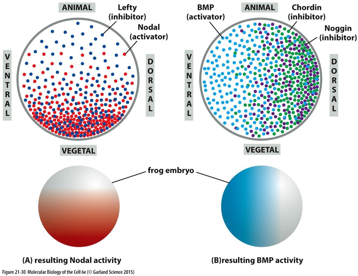 Patterning the Animal to Vegetal Axis: Vegetal cells secrete a TGF beta family member. Xnr: xenopus Nodal Related. High concentrations specify endoderm and lower concentrations specift mesoderm. Vegetal cells also secrete a TGF beta family member that antagonises NODAL, it is called LEFTY whixh diffuses more rapidly than Nodal. There is a gradient in Nodal activity from the vegetal to the animal pole which specifies endoderm, mesoderm and ectoderm. Patterning Dorsal-ventral axis BMPs (bone morphogenic proteins) are secreted throughout the embryo. The BMP antagonists CHORDIN and NOGGIN are secreted from the dorsal side by the organizer. Ectodermal cells which see high BMP activity become epidermal. Ectodermal cells which see low BMP activity remain neural. If you treat animal poles cells with intermediate concentrations of nodal and BMP they will become blood (ventral mesoderm)