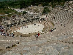 DIONIZJEKult boga Dionizosa był rozpowszechniony. Dionizos był bogiem wina i zabawy. Odbywały się małe Dionizje i Wielkie Dionizje. Wiosną u stóp Akropolu obchodzono Wielkie Dionizje. Jak przebiegały Dionizje?Posąg Dionizosa wynoszono za miasto, do gaju zwanego Akademią. Posąg w uroczystej procesji wnoszono do miasta. Następnego dnia Dionizosa przenoszono do teatru - specjalnej budowli. Ludzie składali ofiary. wybierano specjalną komisję, której zadaniem była ocena wystawianych sztuk.CHÓR I AKTORZY W V w. p.n.e. ukształtowały się dwa podstawowe gatunki literackie dramatu: tragedia i komedia. Aktorami byli tylko mężczyźni. Zarówno chórzyści jak aktorzy nosili maski. Chór liczył nawet 200 śpiewaków. Widowiska łączyły w ten sposób słowo, gest taneczny i muzykę. BUDOWA TEATRU Początkowo przedstawienia odbywały się najprawdopodobniej na ateńskiej Agorze. Na przestrzeni V i IV w. p.n.e. wzniesionoj konstrukcje kamienne, które ostatecznie ukształtowały założenia teatru greckiego. Wyodrębniono: scene - budynek służący do przebierania się aktorów, proskenion - podium na którym występowali aktorzy, orchestra wraz z thymele, parodos - paradne przejścia dla aktorów. Teatr w Epidauros jednym z najlepiej zachowanych teatrów w Grecji.SZTUKI WYSTAWIANE W TEATRZE Podczas czterodniowych świąt wystawiano dwa rodzaje sztuk. Przez pierwsze trzy dni wystawiano tragedie, a czwartego – komedie. TRAGEDIA – jest to gatunek dramatu, obejmujący utwory, których ośrodkiem akcji jest nieprzezwyciężalny konflikt między dążeniami człowieka a siłami wyższymi: losem, prawami historii, normą moralną, wolą bogów, itp. Konflikt ten nieubłaganie prowadzi do klęski. Bohater jest z góry skazany na przegraną, każde posunięcie prowadzi do katastrofy. Budowa tragedii podlegała ścisłym prawom.Budowa tragedii: prolog - zarys fabuły parodos - pierwsza pieśń chóru epejsodia - (sceny dialogowe) i stasima (pieśni chóru, zazwyczaj 3-5) exodos - końcowa pieśń chóru NAJWIĘKSI TRAGICY GRECCY AJSCHYLOS (525 – 456) - autor 70 tragedii i 20 dramatów satyrowych. do czasów współczesnych zachowało się 7 tragedii. SOFOKLES (około 496 – 406), tragediopisarz grecki; zajmuje pośrednie miejsce między Ajschylosem i Eurypidesem; autor około 120 sztuk (ok. 90 tragedii i 30 dramatów satyrowych), z których zachowało się 7 tragedii: EURYPIDES (ok. 485 – 406), tragediopisarz grecki. Z 90 sztuk Eurypidesa zachowało się 17 tragedii. KOMEDIA KOMEDIA – jest to gatunek dramatu pochodzący od obrzędowych zabaw ludowych (świąteczny orszak przebierańców w czasie święta Dionizosa), pełen żartów i kpin, przedstawiający zabawne sytuacje z życia ludzi.