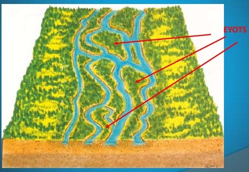 Braided channels are a result of several channels divided into sub-channels by temporary islands called 'eyots' or 'braid bars'. This feature of rivers often contains larger loads of sand and gravel.