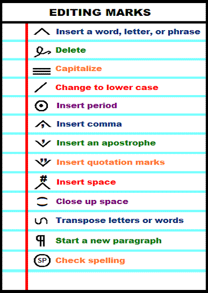 Steps:1. Capitalization: Every word that starts a sentence should be capitalized. All proper nouns should be capitalized. If a word is capitalized when it shouldn't be, fix it!2. End marks: At the end of every sentence, there should be a period or another end mark (! or ?).3. Spelling: Check for errors. Sometimes letters get mixed up too, so those letters need to be moved (transpose).4. Commas: Use commas for lists (oranges, apples, bananas), to set apart two adjectives (the strong, handsome man), or to begin a second part of the sentence (I wanted to eat, but I needed to go to the meeting first).5. Reading through the story: Does it make sense? Does it have enough detail?