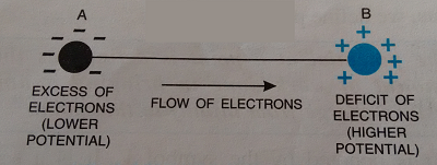 Electric Potential (symbol: V) If two charged conductors are placed in contact with each other the direction of the flow of electrons is determined by a quantity called the electric potential of the conductor. The electric potential depends mainly on the concentration of charges on the conductor (and also it's shape and size). Consider two conductors, one is A with an more electrons than protons and therefore negatively charged, and the second is B with less electrons than protons and therefore positively charged. When A and B are placed in contact with each other (or joined by a metallic wire) electrons will flow from A, which has more electrons, to B, which has less electrons so that eventually both A and B have the same number of excess electrons, or in other words have the same charge.The conductor A with an excess of electrons is said to be at a negative (or lower) potential while the conductor B with a deficit of electrons is said to be at a positive (or higher) potential. Electrons flow from the conductor at lower potential to the conductor at the higher potential.For electrons to flow between two conductors, there has to be a potential difference between them. The SI unit for measuring potential and potential difference is the volt (V). The potential difference between two points is measured using a device called a voltmeter.
