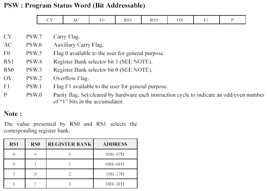 Flags: 1 bit registers provided to store the status of results of some instruction : It is a flip flop8051 has :-4 math flags: Carry(CY), Auxiliary carry(AC), Overflow(OV), Parity(P)-3 general purpose user flag:1) Carry flag (CY) - Set when there is a carry or borrow out of the MSB (D7) of the result2)Auxiliary carry ( AC) -Set when there is a carry out from lower nibble to higher nibble or borrow from higher nibble to lower nibble3)Overflow flag(OV)-arithmetic overflow has occurred4)Parity flag(P)-the result has even parity (even no. of 1's)General purpose flags-can be set 1 or 0 as programmer desires-F0,GF0,GF! are the three general purpose flag-F0 is in PSW and GF0 and GF1 are in PCON register