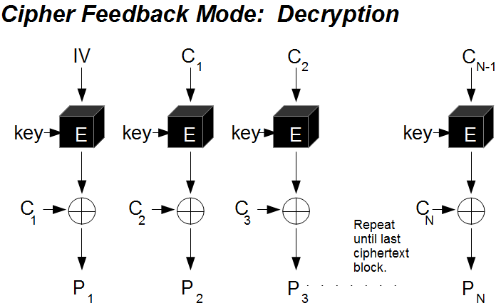Decryption Start with the initialization vector (IV). Pass IV and key to the encryption function. XOR the result of the encryption function with the first ciphertext block. The result is the first plaintext block. Take the ciphertext block from the previous operation. Pass the ciphertext block and the key to the encryption function. XOR the result of the encryption function with the next ciphertext block. The result is the next plaintext block. Go back to step 5, and repeat until there are no ciphertext blocks remaining.