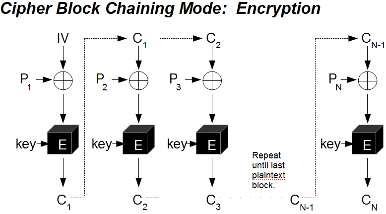 Encryption Start with an initialization vector (IV). XOR the IV with the first block of plaintext. Pass the result and the key to the encryption function. The result of the operation is the first ciphertext block. XOR the resulting ciphertext block with the next plaintext block. Pass the result and the key to the encryption function. The result of the operation is the next ciphertext block. Go back to step 5 and repeat until there are no more plaintext blocks remaining.