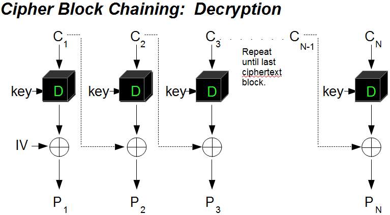 Decryption Take the first ciphertext block. Pass the ciphertext block and the key to the decryption function. XOR the result of the operation with the initialization vector (IV). The result is the first plaintext block. Pass the next ciphertext block and the key to the decryption function. XOR the result of the operation with the ciphertext block from the previous decryption step. The result is the next plaintext block. Go back to step 5 and repeat until there are no more ciphertext blocks remaining.