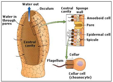 Structure and Function Collar cells are embedded in a gelatinous (spongy) matrix and supported by a skeleton of needle-like spicules and spongin fibers - elastic proteinaceous fibersPores, canals and chambers form a system of water currents one which they use to obtain food and oxygen. - tiny pores ostia are for incoming water and larger openings are for water outlet osculaCoanocytes - 'collar cells'Amoeboid cells in sponges are called Archaeocytes - used for phagocytosis and can differentiate into secreting cells and secrete spicules, spongin fibers and collagen.Pinacocytes are flat cells that line the external surfaces - creating a pinacoderm which helps to keep water out.No respiratory or excretory organs as these function can occur through diffusiongenerally sessile organisms - stationary. But some can crawl slowly Reproduction - asexual (budding - develops from the outgrowth/bud due to cell division at one particular site) and sexual.Has specialised cells but not organised tissues or organs