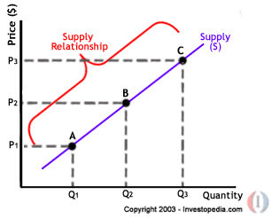 Law of supply A direct relationship exists between price and quantity supplied of a good. Price increases, quantity supplied of a good increases Price decreases, quantity supplied of a good decreases. Why direct relationshipProducers are more willing to sell greater amounts at higher price, because the good have become relatively more profitable to produce.Higher price will help producers cover the higher opportunity cost.