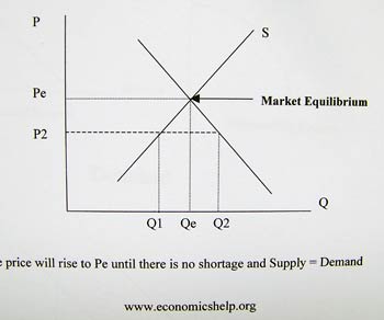 Shortage (Qd>Qs) Occurs when quantity demanded exceeds quantity supplied. Upward pressure on price as buyers increase price As price increases, sellers sell more and buyers buy less, until equilibrium is attained.